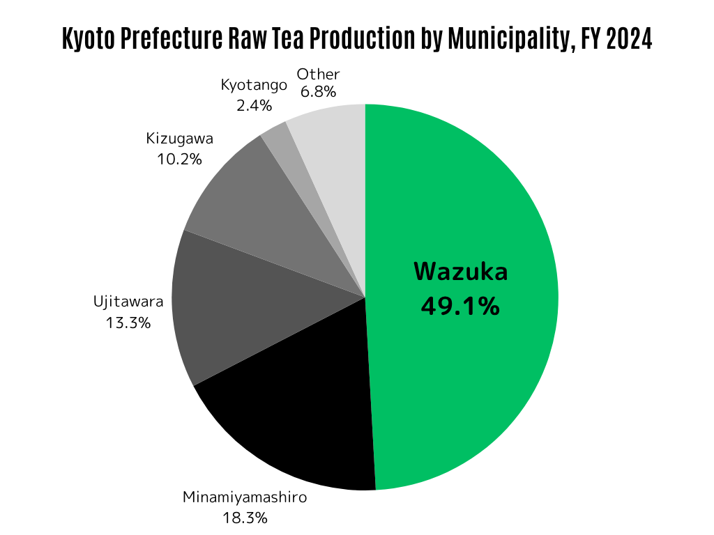In the 2024 fiscal year, Wazuka Town produced 49.1% (approximately 1,224 tons) of the raw tea grown in Kyoto Prefecture. Additionally, Wazuka Town was responsible for 51.9% (approximately 549 tons) of the tencha, the raw material used for making matcha.